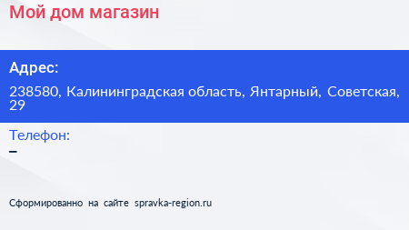 Мой дом, магазин по адресу 238580, Калининградская область, Янтарный, Советская, 29 в дальнейшем Организация, размещена в следующих категориях:
