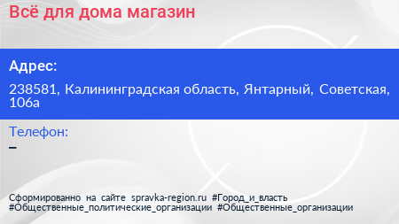 Всё для дома, магазин по адресу 238581, Калининградская область, Янтарный, Советская, 106а в дальнейшем Организация, размещена в следующих категориях: