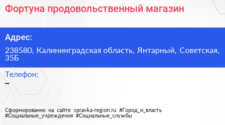 Фортуна, продовольственный магазин по адресу 238580, Калининградская область, Янтарный, Советская, 35Б в дальнейшем Организация, размещена в следующих категориях: