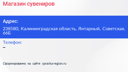 Магазин сувениров по адресу 238580, Калининградская область, Янтарный, Советская, 66Б в дальнейшем Организация, размещена в следующих категориях: