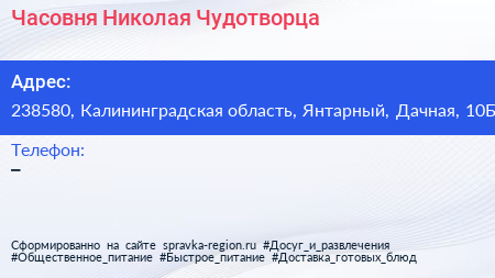 Часовня Николая Чудотворца по адресу 238580, Калининградская область, Янтарный, Дачная, 10Б в дальнейшем Организация, размещена в следующих категориях: