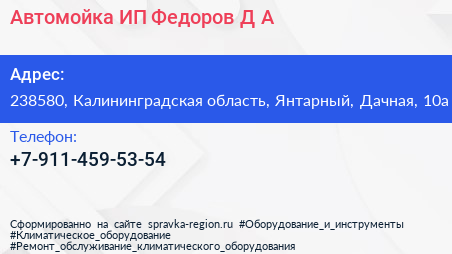 Автомойка, ИП Федоров Д.А. по адресу 238580, Калининградская область, Янтарный, Дачная, 10а в дальнейшем Организация, размещена в следующих категориях: