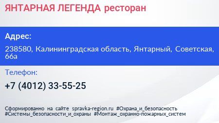 ЯНТАРНАЯ ЛЕГЕНДА, ресторан по адресу 238580, Калининградская область, Янтарный, Советская, 66а в дальнейшем Организация, размещена в следующих категориях: