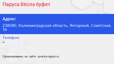 Паруса & Вёсла, буфет по адресу 238580, Калининградская область, Янтарный, Советская, 1в в дальнейшем Организация, размещена в следующих категориях:
