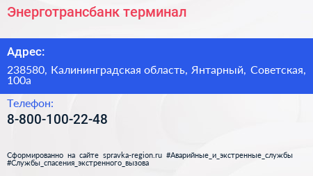 Энерготрансбанк, терминал по адресу 238580, Калининградская область, Янтарный, Советская, 100а в дальнейшем Организация, размещена в следующих категориях: