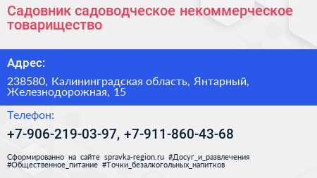 Садовник, садоводческое некоммерческое товарищество по адресу 238580, Калининградская область, Янтарный, Железнодорожная, 15 в дальнейшем Организация, размещена в следующих категориях:
