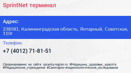 SprintNet, терминал по адресу 238581, Калининградская область, Янтарный, Советская, 110г в дальнейшем Организация, размещена в следующих категориях: