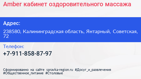 Amber, кабинет оздоровительного массажа по адресу 238580, Калининградская область, Янтарный, Советская, 72 в дальнейшем Организация, размещена в следующих категориях:
