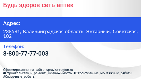 Будь здоров, сеть аптек по адресу 238581, Калининградская область, Янтарный, Советская, 102 в дальнейшем Организация, размещена в следующих категориях: