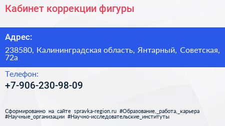 Кабинет коррекции фигуры по адресу 238580, Калининградская область, Янтарный, Советская, 72а в дальнейшем Организация, размещена в следующих категориях: