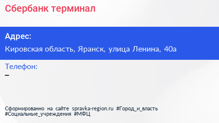 Сбербанк, терминал по адресу Кировская область, Яранск, улица Ленина, 40а в дальнейшем Организация, размещена в следующих категориях: