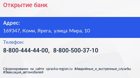 Открытие, банк по адресу 169347, Коми, Ярега, улица Мира, 10 в дальнейшем Организация, размещена в следующих категориях: