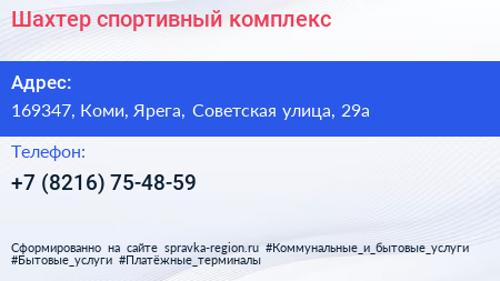 Шахтер, спортивный комплекс по адресу 169347, Коми, Ярега, Советская улица, 29а в дальнейшем Организация, размещена в следующих категориях: