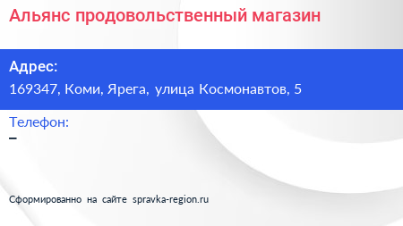 Альянс, продовольственный магазин по адресу 169347, Коми, Ярега, улица Космонавтов, 5 в дальнейшем Организация, размещена в следующих категориях: