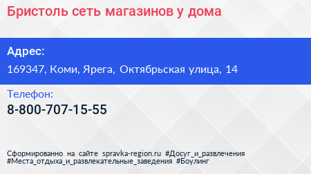 Бристоль, сеть магазинов у дома по адресу 169347, Коми, Ярега, Октябрьская улица, 14 в дальнейшем Организация, размещена в следующих категориях: