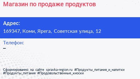 Магазин по продаже продуктов по адресу 169347, Коми, Ярега, Советская улица, 12 в дальнейшем Организация, размещена в следующих категориях: