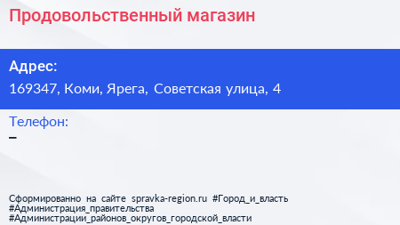 Продовольственный магазин по адресу 169347, Коми, Ярега, Советская улица, 4 в дальнейшем Организация, размещена в следующих категориях:
