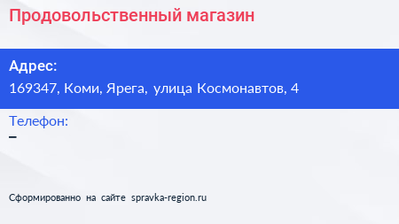 Продовольственный магазин по адресу 169347, Коми, Ярега, улица Космонавтов, 4 в дальнейшем Организация, размещена в следующих категориях: