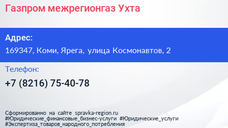 Газпром межрегионгаз Ухта по адресу 169347, Коми, Ярега, улица Космонавтов, 2 в дальнейшем Организация, размещена в следующих категориях: