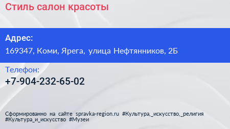 Стиль, салон красоты по адресу 169347, Коми, Ярега, улица Нефтянников, 2Б в дальнейшем Организация, размещена в следующих категориях: