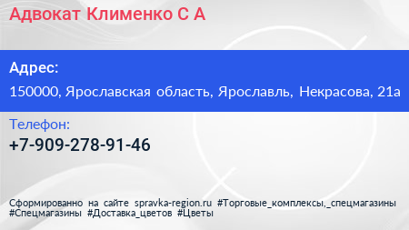 Адвокат Клименко С.А. по адресу 150000, Ярославская область, Ярославль, Некрасова, 21а в дальнейшем Организация, размещена в следующих категориях: