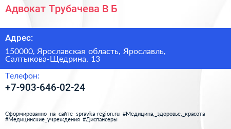 Адвокат Трубачева В.Б. по адресу 150000, Ярославская область, Ярославль, Салтыкова-Щедрина, 13 в дальнейшем Организация, размещена в следующих категориях: