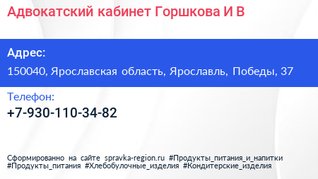 Адвокатский кабинет Горшкова И.В. по адресу 150040, Ярославская область, Ярославль, Победы, 37 в дальнейшем Организация, размещена в следующих категориях: