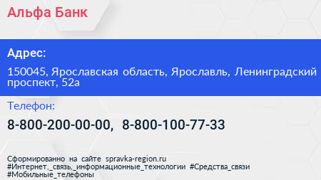 Альфа-Банк по адресу 150045, Ярославская область, Ярославль, Ленинградский проспект, 52а в дальнейшем Организация, размещена в следующих категориях: