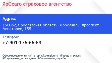 ЯрОсаго, страховое агентство по адресу 150062, Ярославская область, Ярославль, проспект Авиаторов, 155 в дальнейшем Организация, размещена в следующих категориях: