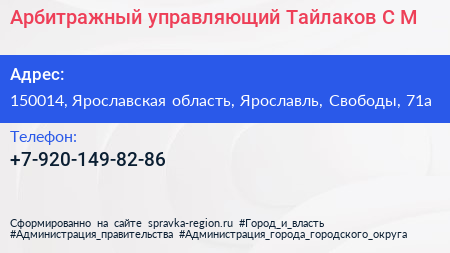 Арбитражный управляющий Тайлаков С.М. по адресу 150014, Ярославская область, Ярославль, Свободы, 71а в дальнейшем Организация, размещена в следующих категориях: