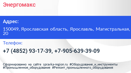 Энергомакс по адресу 150049, Ярославская область, Ярославль, Магистральная, 20 в дальнейшем Организация, размещена в следующих категориях: