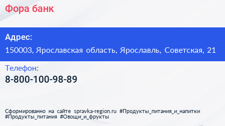 Фора-банк по адресу 150003, Ярославская область, Ярославль, Советская, 21 в дальнейшем Организация, размещена в следующих категориях: