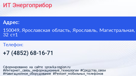 ИТ-Энергоприбор по адресу 150049, Ярославская область, Ярославль, Магистральная, 32 ст1 в дальнейшем Организация, размещена в следующих категориях: