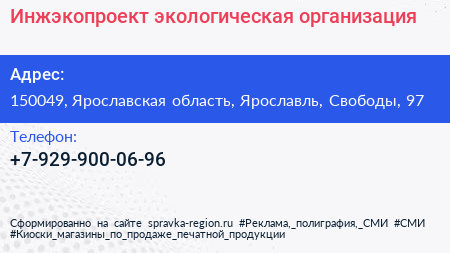 Инжэкопроект, экологическая организация по адресу 150049, Ярославская область, Ярославль, Свободы, 97 в дальнейшем Организация, размещена в следующих категориях: