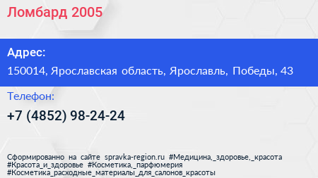 Ломбард 2005 по адресу 150014, Ярославская область, Ярославль, Победы, 43 в дальнейшем Организация, размещена в следующих категориях: