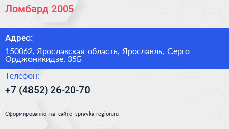 Ломбард 2005 по адресу 150062, Ярославская область, Ярославль, Серго Орджоникидзе, 35Б в дальнейшем Организация, размещена в следующих категориях: