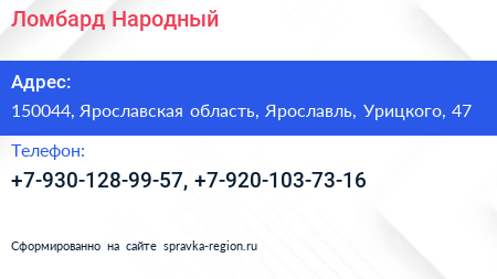 Ломбард Народный по адресу 150044, Ярославская область, Ярославль, Урицкого, 47 в дальнейшем Организация, размещена в следующих категориях: