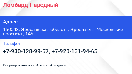 Ломбард Народный по адресу 150048, Ярославская область, Ярославль, Московский проспект, 145 в дальнейшем Организация, размещена в следующих категориях: