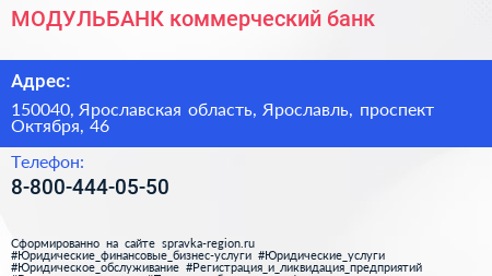 МОДУЛЬБАНК, коммерческий банк по адресу 150040, Ярославская область, Ярославль, проспект Октября, 46 в дальнейшем Организация, размещена в следующих категориях: