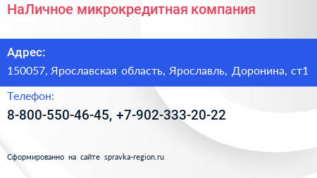 НаЛичное, микрокредитная компания по адресу 150057, Ярославская область, Ярославль, Доронина, ст1 в дальнейшем Организация, размещена в следующих категориях: