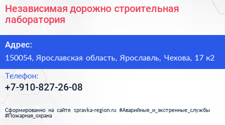 Независимая дорожно-строительная лаборатория по адресу 150054, Ярославская область, Ярославль, Чехова, 17 к2 в дальнейшем Организация, размещена в следующих категориях: