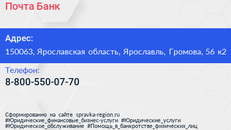 Почта Банк по адресу 150063, Ярославская область, Ярославль, Громова, 56 к2 в дальнейшем Организация, размещена в следующих категориях:
