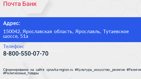 Почта Банк по адресу 150042, Ярославская область, Ярославль, Тутаевское шоссе, 51а в дальнейшем Организация, размещена в следующих категориях: