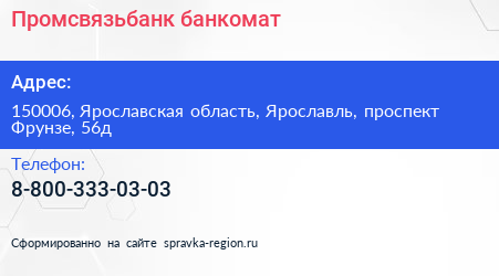 Промсвязьбанк, банкомат по адресу 150006, Ярославская область, Ярославль, проспект Фрунзе, 56д в дальнейшем Организация, размещена в следующих категориях: