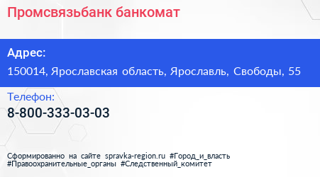 Промсвязьбанк, банкомат по адресу 150014, Ярославская область, Ярославль, Свободы, 55 в дальнейшем Организация, размещена в следующих категориях: