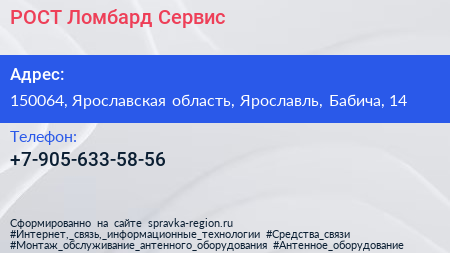 РОСТ Ломбард-Сервис по адресу 150064, Ярославская область, Ярославль, Бабича, 14 в дальнейшем Организация, размещена в следующих категориях: