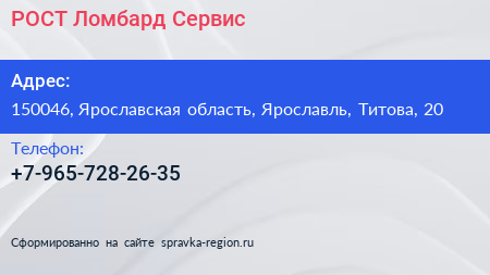 РОСТ Ломбард-Сервис по адресу 150046, Ярославская область, Ярославль, Титова, 20 в дальнейшем Организация, размещена в следующих категориях: