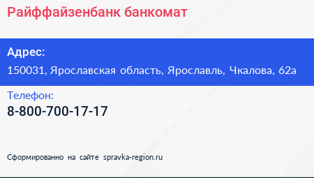 Райффайзенбанк, банкомат по адресу 150031, Ярославская область, Ярославль, Чкалова, 62а в дальнейшем Организация, размещена в следующих категориях: