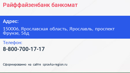 Райффайзенбанк, банкомат по адресу 150006, Ярославская область, Ярославль, проспект Фрунзе, 56д в дальнейшем Организация, размещена в следующих категориях: