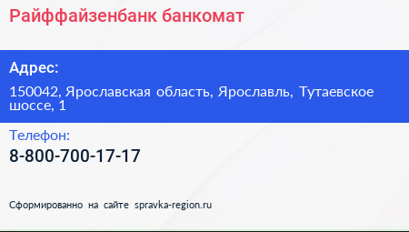 Райффайзенбанк, банкомат по адресу 150042, Ярославская область, Ярославль, Тутаевское шоссе, 1 в дальнейшем Организация, размещена в следующих категориях: